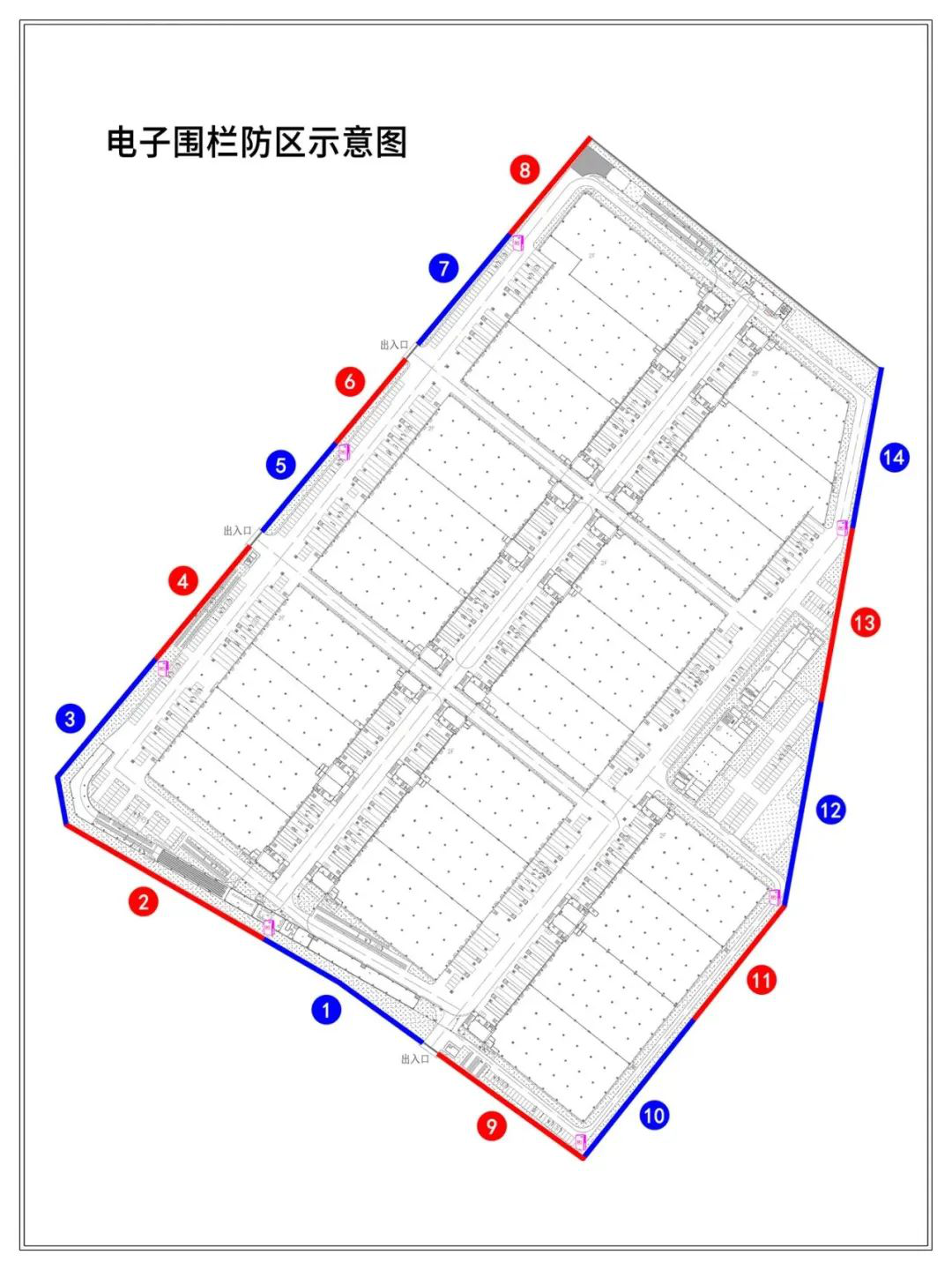 3、按照脈沖圍欄國家標準GB7946-2015規定單個防區不能超過100米,項目上我們設計為14個防區。