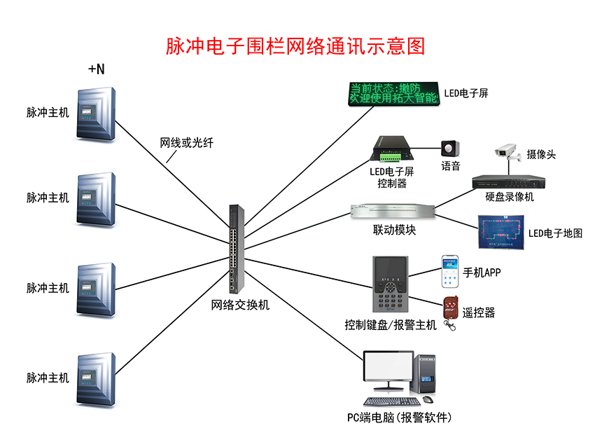 脈沖電子圍欄報(bào)警系統(tǒng)示意圖——網(wǎng)絡(luò)通訊+LED電子屏+語(yǔ)音