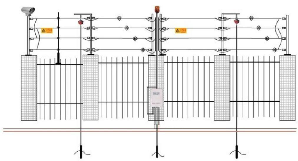 一般脈沖電子圍欄脈沖主機和防雨箱放在兩個防區之間,倆如200米的周界分兩個防區,那么脈沖主機和防雨箱就固定在100米的位置,也就是兩個防區之間,通過高壓線給左右兩個防區供電。