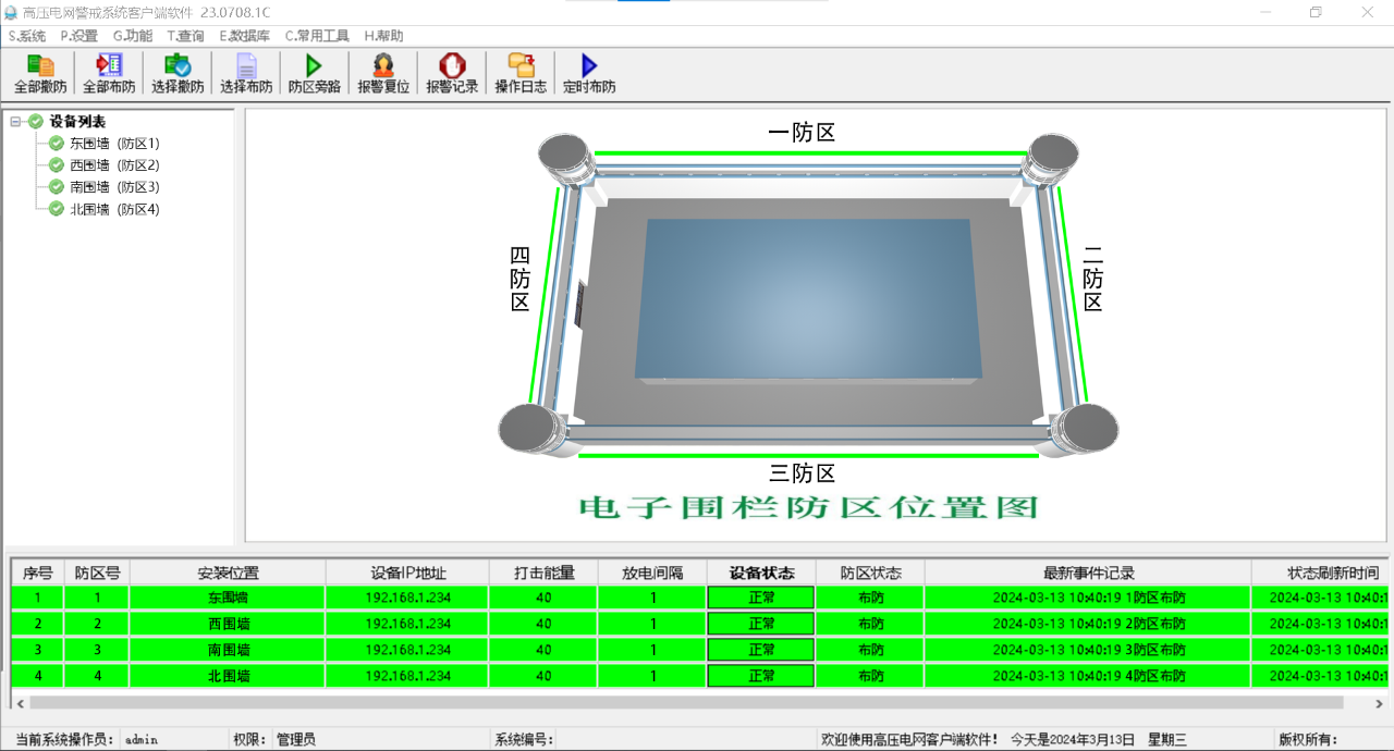 ● 功能:管理控制前端高壓電網主機、分控主機;實時監控前端電網圍欄防區狀態以及對防區參數設定;支持報警信息、軟件操作信息查詢導出